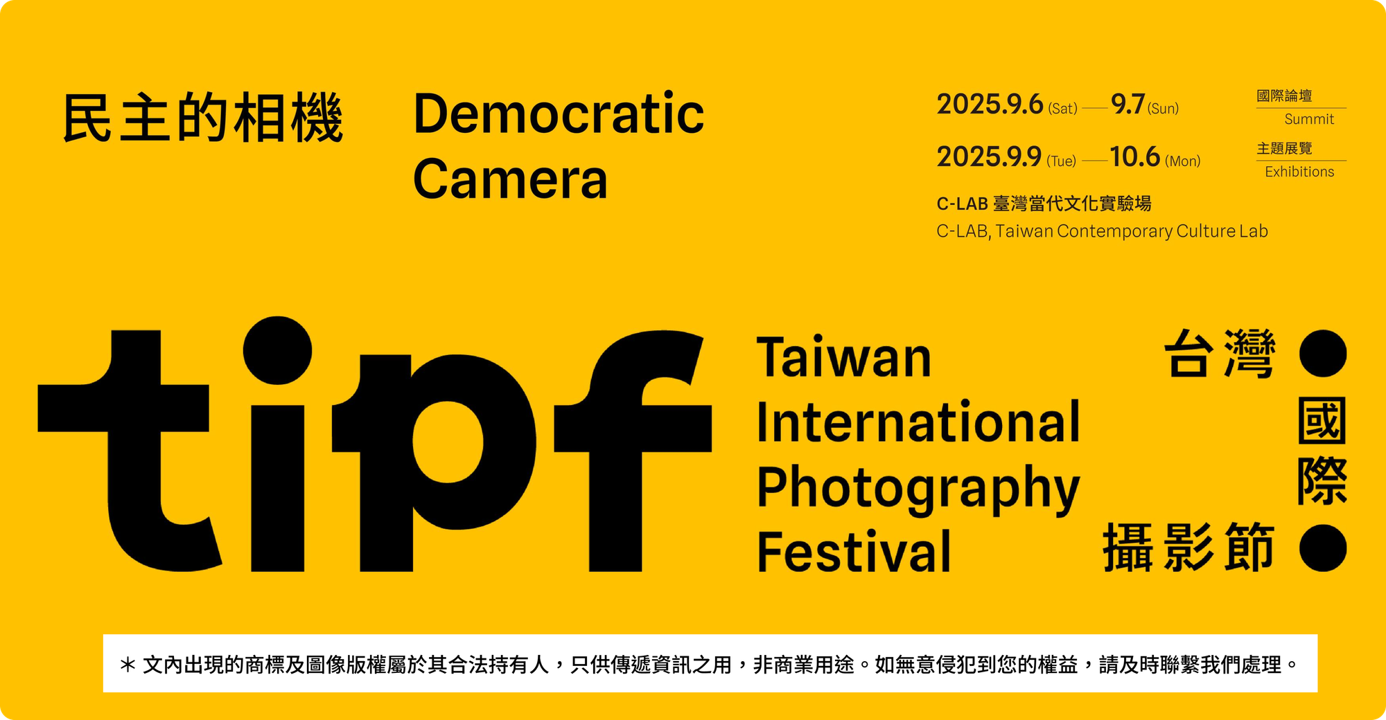 2025 年首屆台灣國際攝影節以「民主的相機」為策展核心,主視覺 LOGO 採用影像與幾何語彙融合設計,象徵攝影與民主之間的張力與對話。