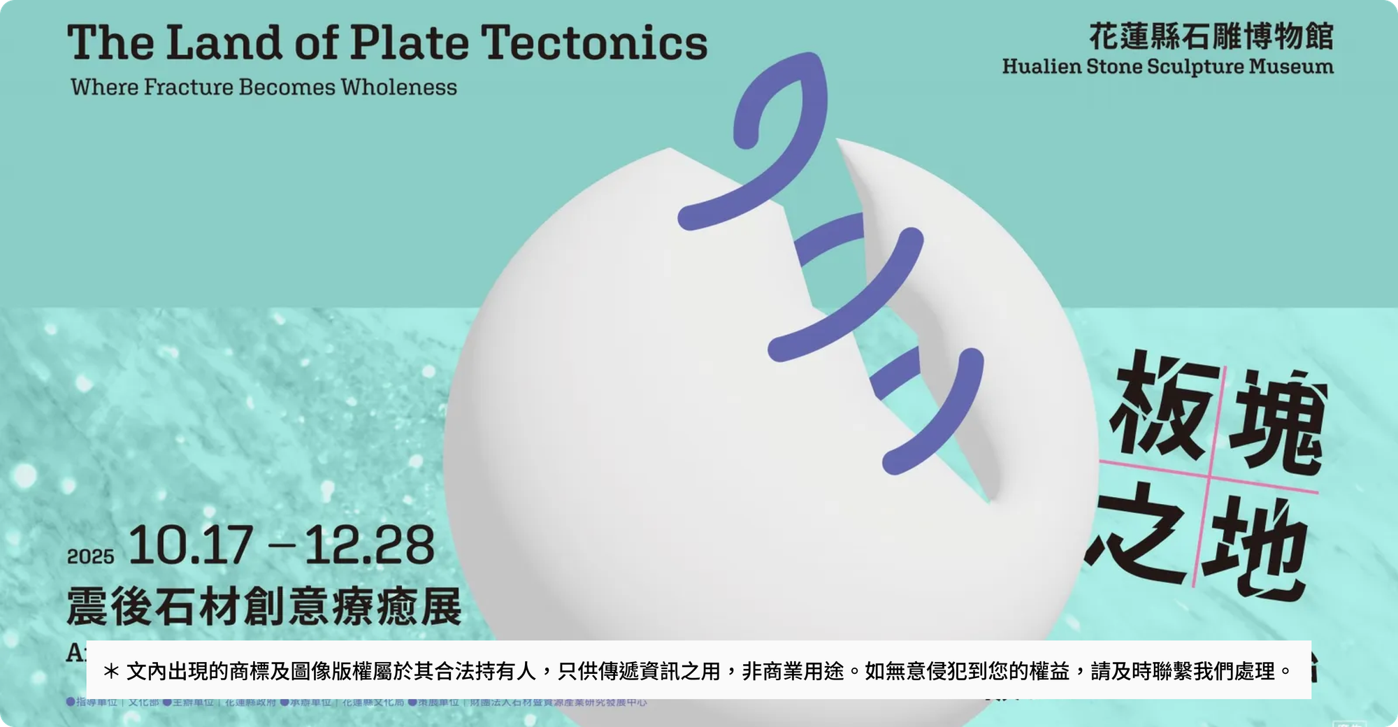《板塊之地-破裂是完整的開始》震後石材創意療癒展將於 10/17 到 12/28 在花蓮縣石雕博物館登場。