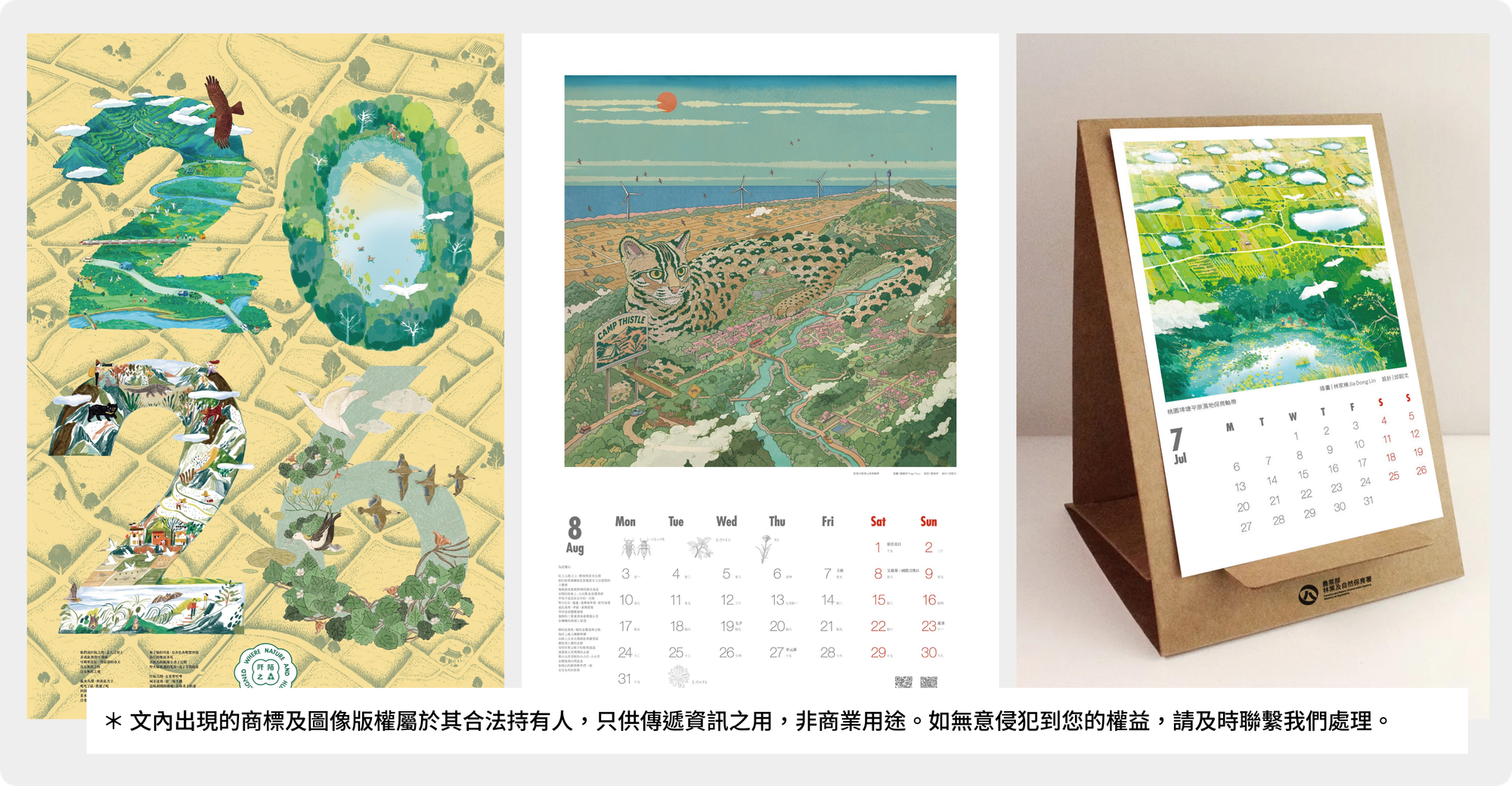 月曆以「國土生態綠網保育軸帶」為核心理念,邀請五位插畫家手繪台灣從淺山、平原、聚落到海岸的12條生態軸帶。設計將抽象的生態系統轉化為具象圖像,引導使用者在月曆中展開視覺旅程:俯瞰農地、穿越溪流、凝視海面。