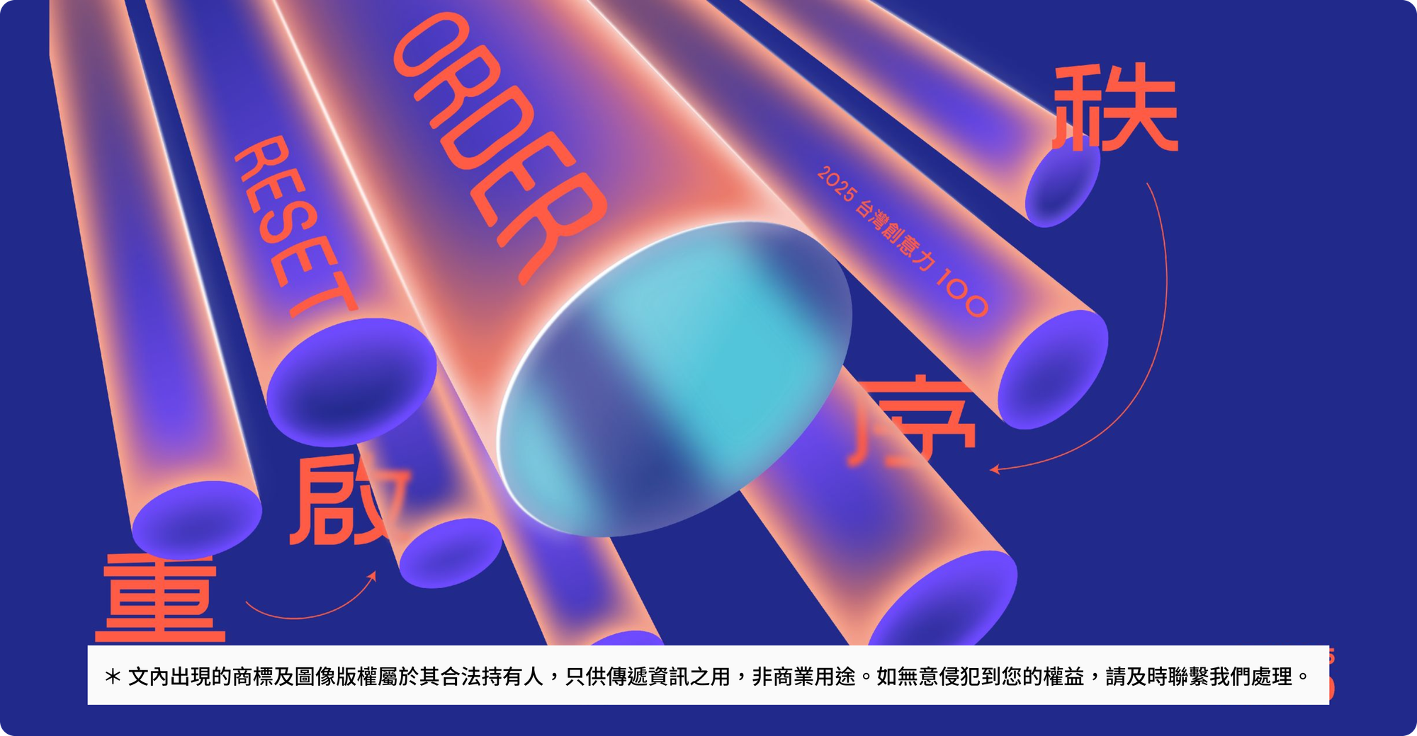 2025 台灣創意力 100 以「秩序重啟 Order Reset」為主構思。設計師湯慕恩將實體「獎盃」拆解為圓形管材與透鏡結構,再重組成絢麗的視覺模組,並延伸到封面、典禮舞台與動態影像,創造「沒有固定形狀與顏色,也能辨識一致性」的視覺系統。
