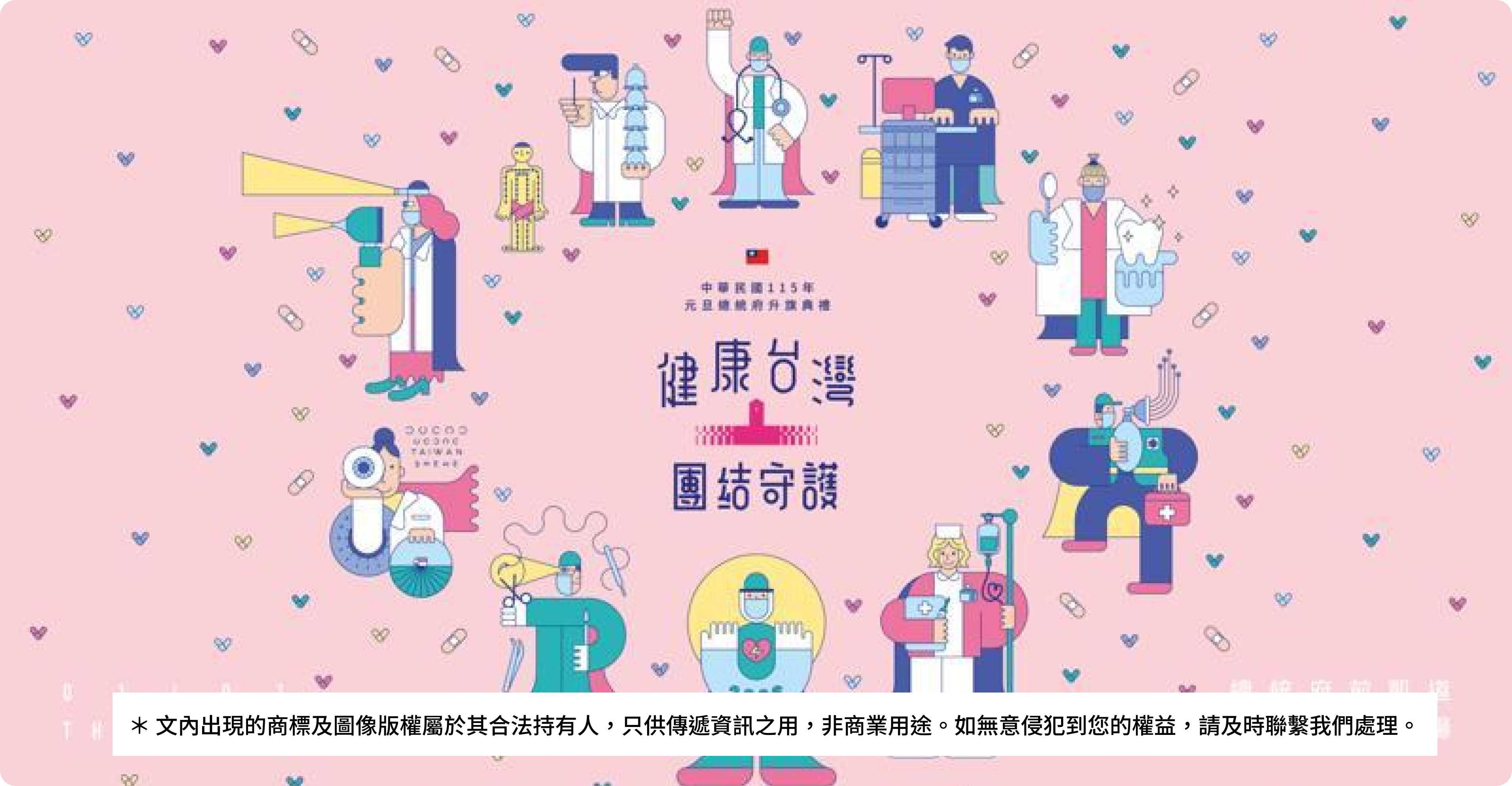 115 年元旦總統府升旗主視覺由旅居巴黎的設計師林琬津操刀,靈感來自花蓮救災中「鏟子超人」的團結互助畫面,轉化為「健康台灣、團結守護」的核心敘事。