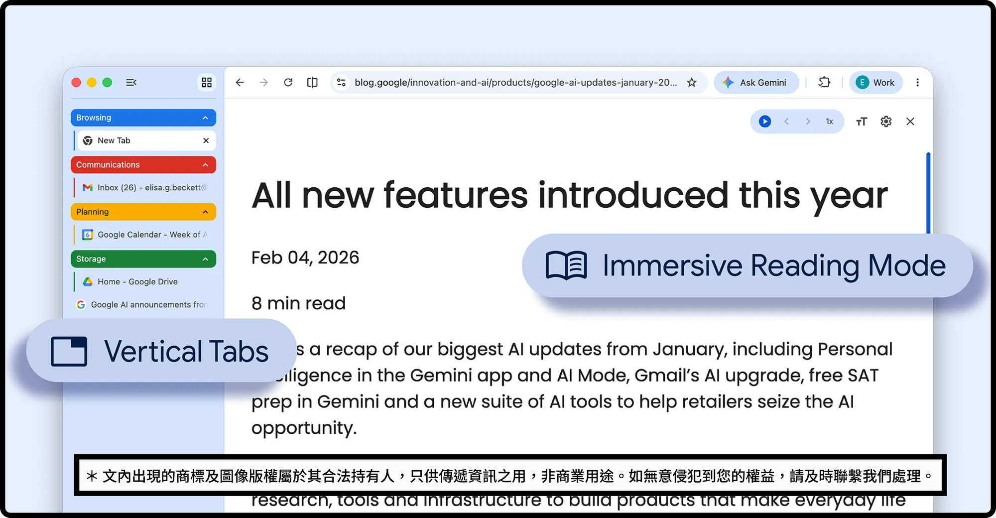 另一項則是新版閱讀模式,可將網頁切換成更聚焦、少干擾的閱讀介面。從產品設計角度看,這次更新不是大改版,而是針對「分頁太多、注意力被切碎」這種高頻痛點做更直接的介面優化。