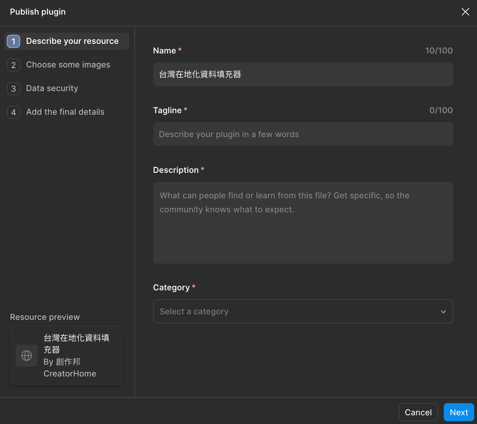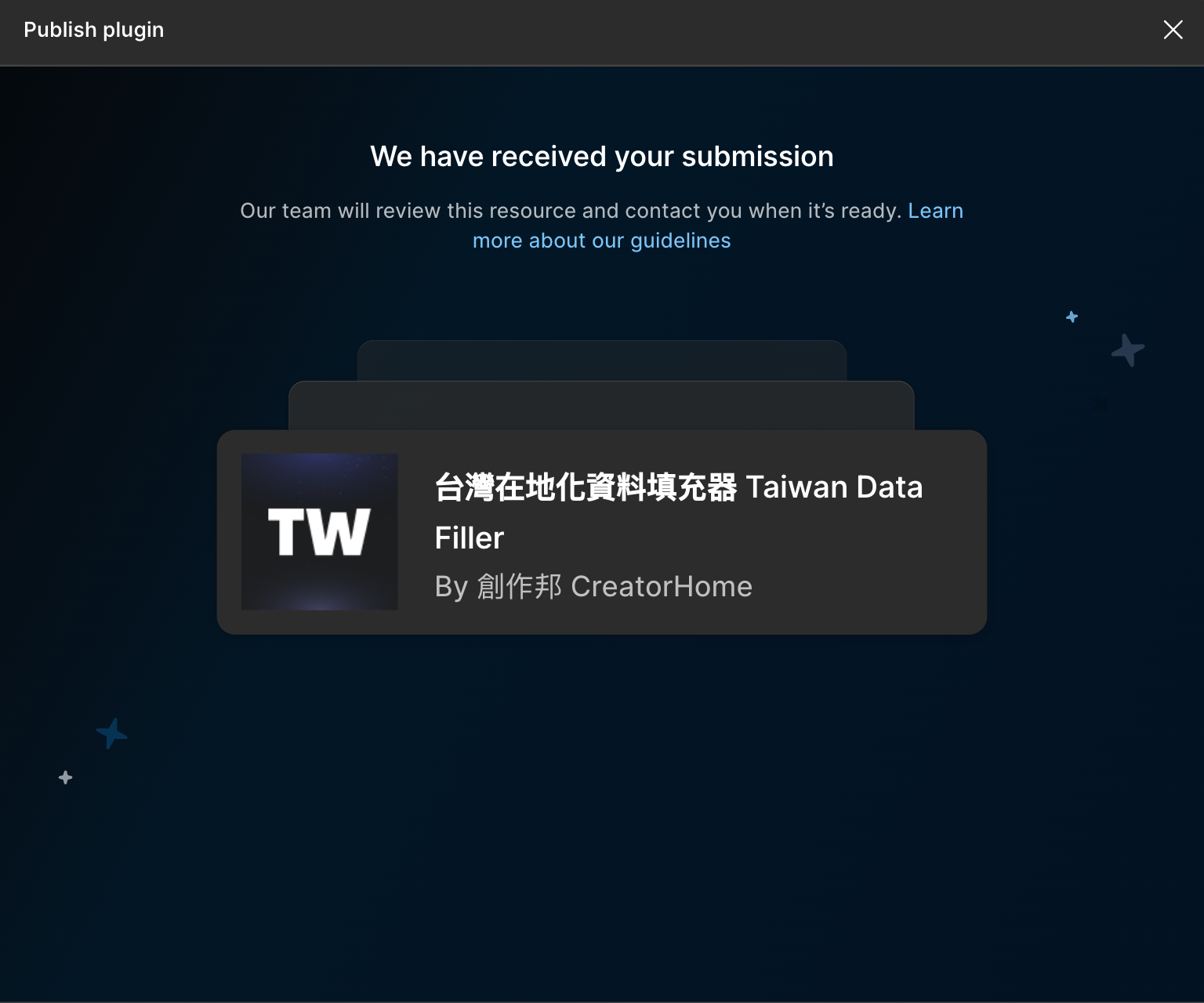 最後就是送審,這步完成後就等待 Figma 那邊審核通知,最快半天到一天就能審核完,我自己過往經驗大概都是一天左右。