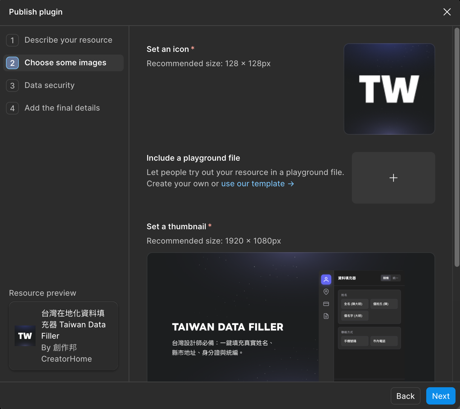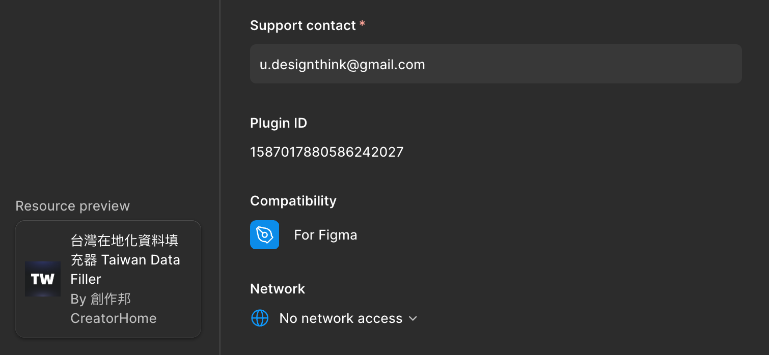 Name:你的 Plugin 名稱這邊建議多數 Plugin 都可以加上英文,因為 Figma 是一個國際化工具,使用者全世界都有,寫上英文會讓更多人可以搜尋到。