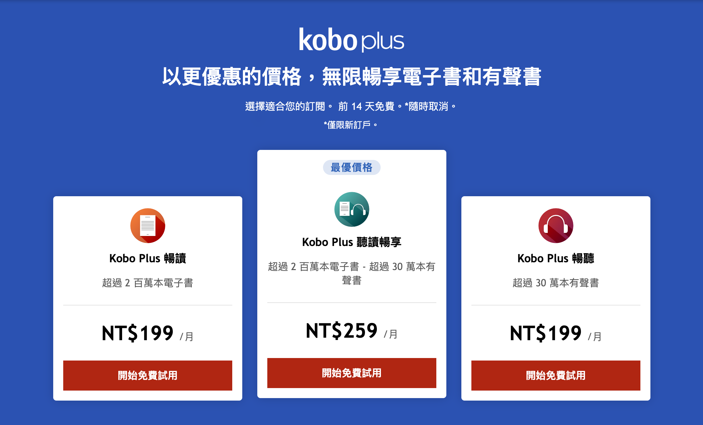 一個月 NT$199 起,不用一本一本買,讀到一半不喜歡也可以直接換下一本,沒什麼壓力,閱讀量高的人超划算,同時 Kobo Plus 方案實際可閱讀書籍依官網為主。