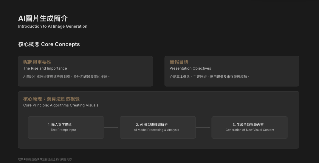 畢竟 AI 生成簡報越來越普遍,但幾乎沒有好看的(以我自己的標準),目前應該是付費才能體驗,所以我截圖給大家看一下效果。