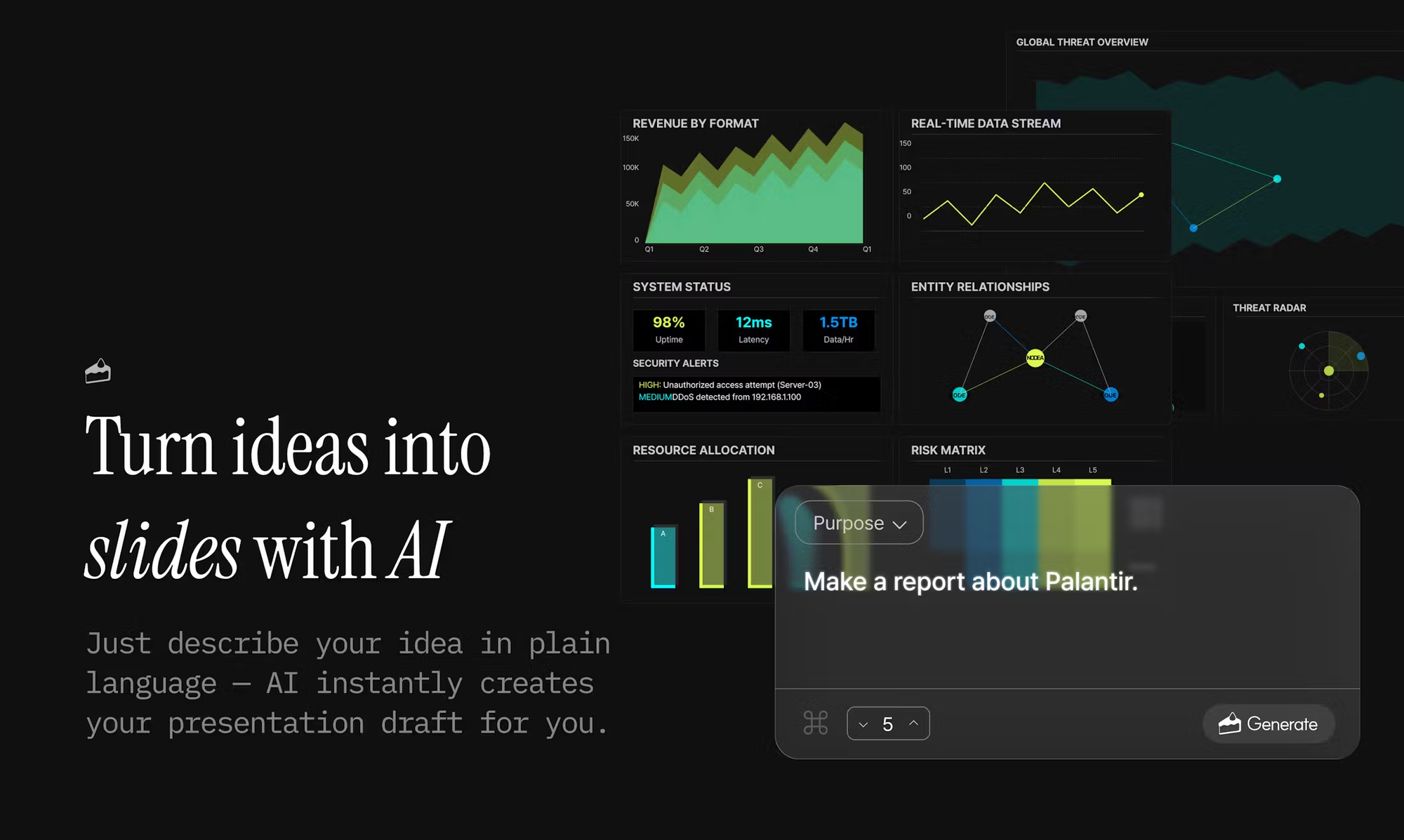 最近發現一款很新的 AI 簡報工具,剛出所以在使用上還有些不成熟,但會想分享的原因是因為他產出的一些簡報排版,是我看過 AI 生成中最好看的,雖然風格上看的出來有一定偏好,但光是好看這點我就很期待這工具後續的發展。