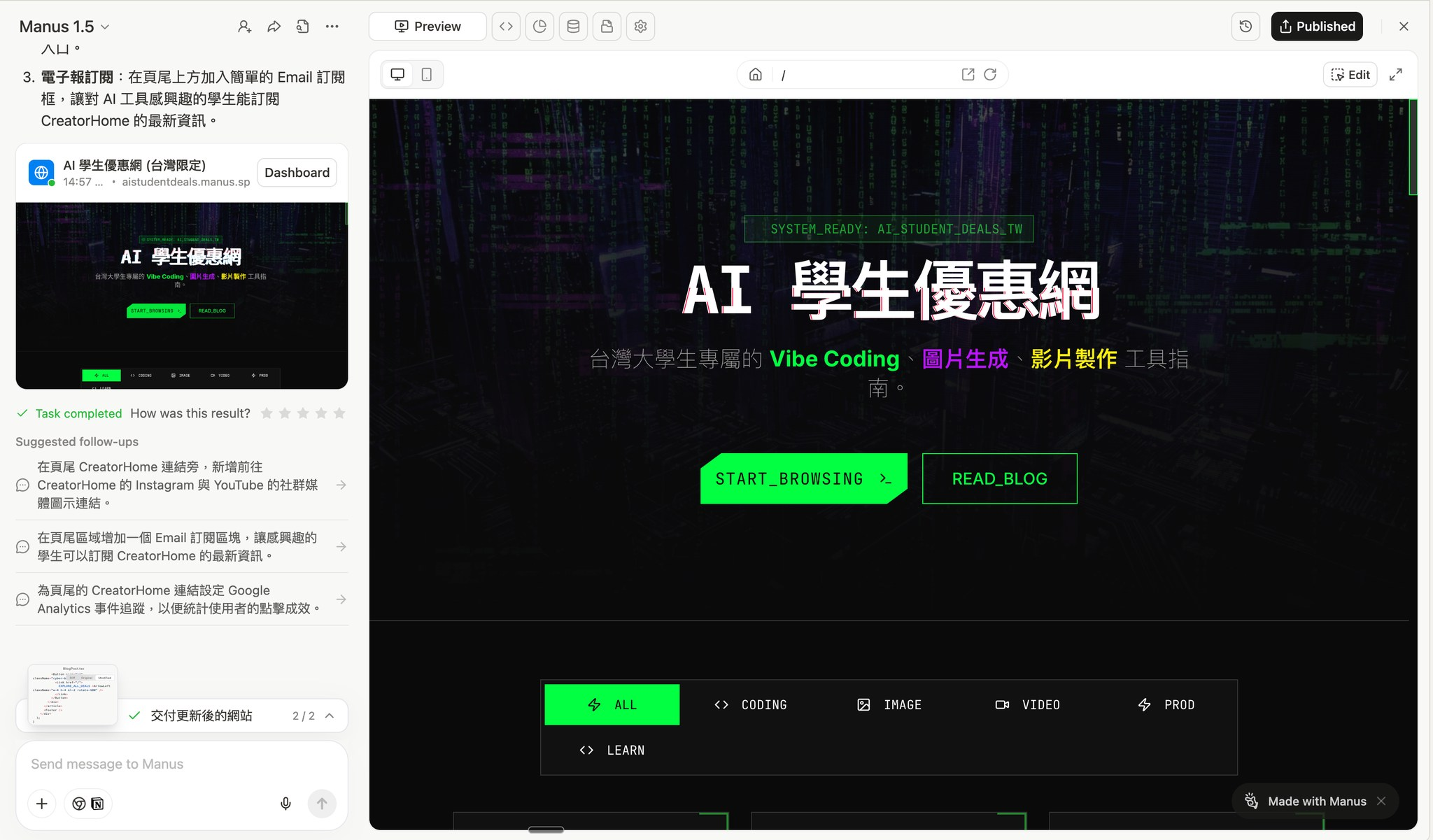 來分享一下我自己使用 Manus 架站的一些心得,主要針對這個工具便利性跟特色做介紹,讓大家在挑選工具使用時可以知道適不適合。